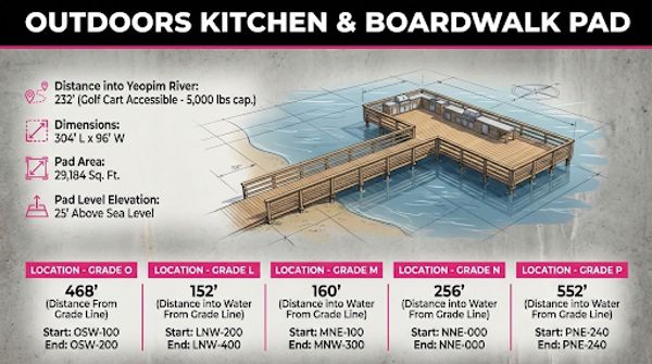 I wanted to entertain family at my house an elevate outdoors kitchen over the river. I want privacy from the world but fun at home. I was going to design the property and take my wife on a 2nd Honeymoon and said you never have to walk on dirt or puddles or water. You have golf cart friendly trails and wood sidewalk that is elevated. I design this property to keep out bugs and dirt to a limit. My outdoor kitchen will be a custom made pergola