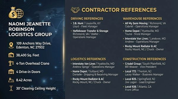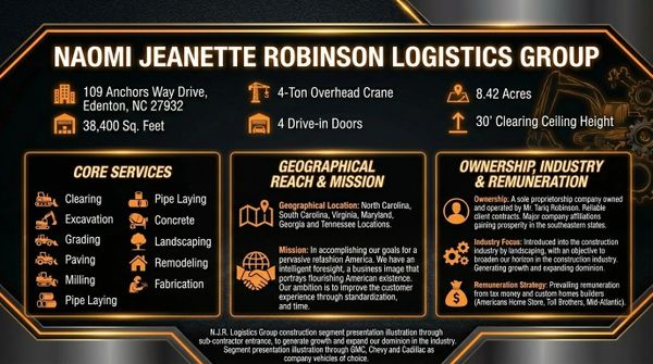 He also has honor, loyalty, and he is dependable. Mr. Robinson's customer service skills are outstanding. With these credentials, Naomi Jeanette Robinson Logistics Group LLC will strive for perfection in achieving a goal as a successful business owner.