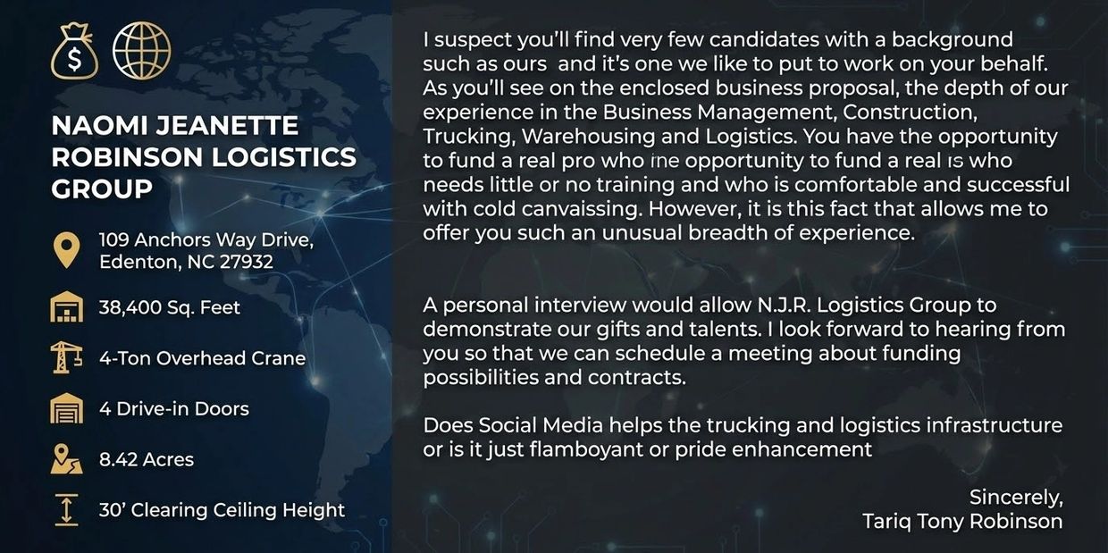 A personal interview would allow N.J.R. Logistics Group to demonstrate our gifts and talents. I look forward to hearing from you so that we can schedule a meeting about funding possibilities and contracts.